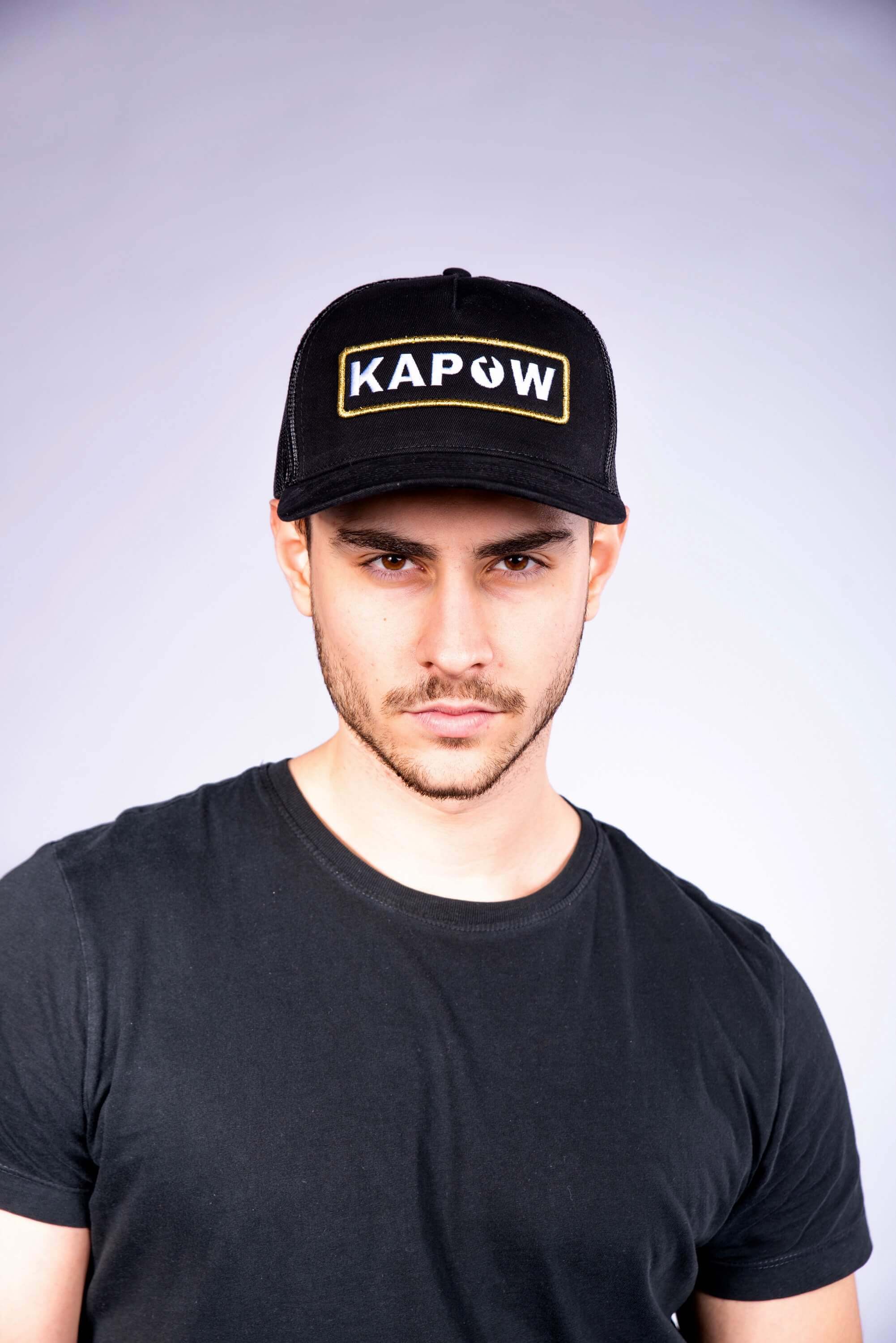 - Description: Black Trucker Cap With Gold Logo Patch